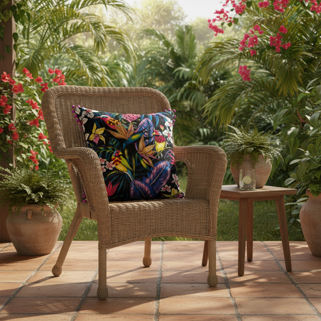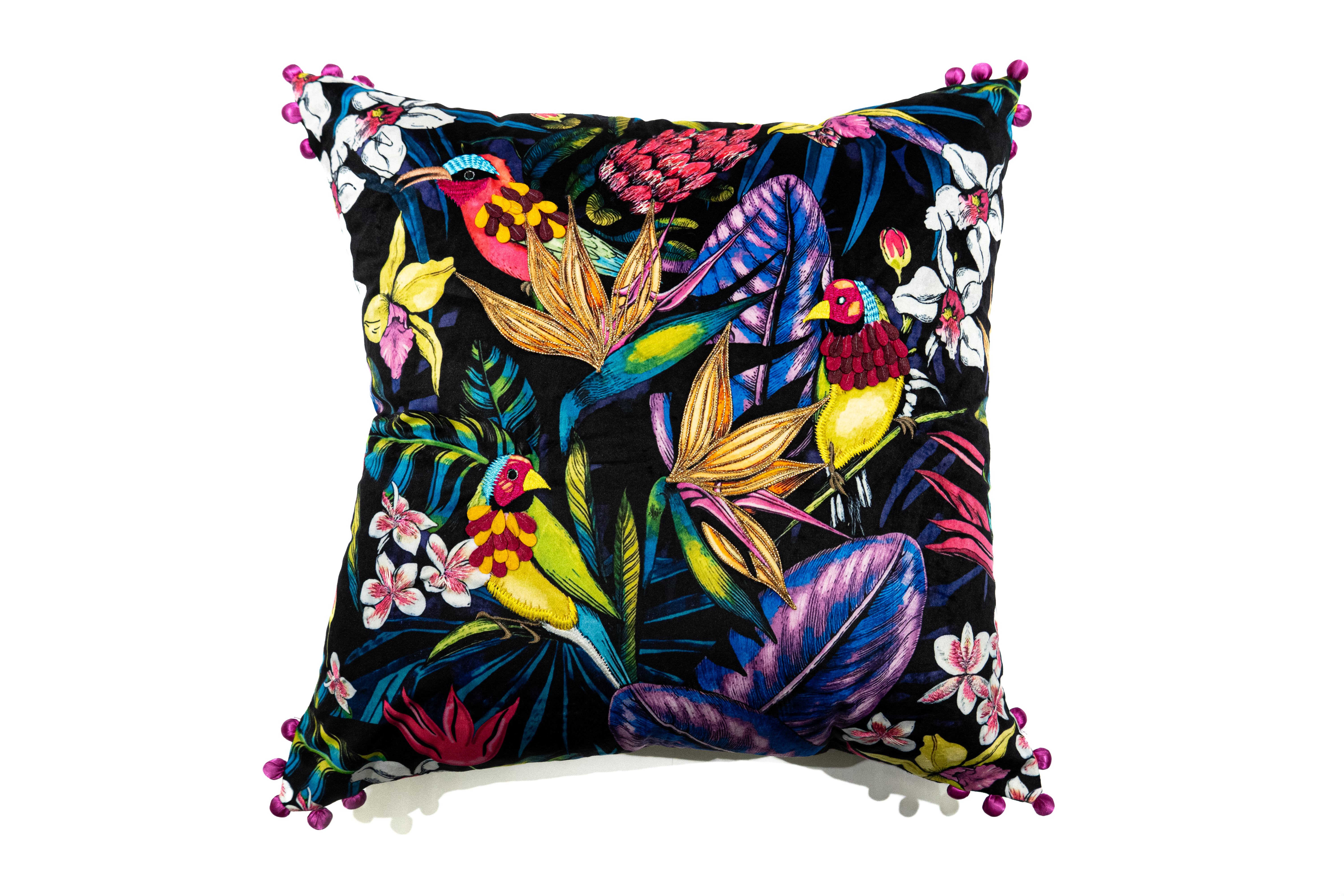 - Design: Multicolor floral and bird motifs with decorative pom poms on corners