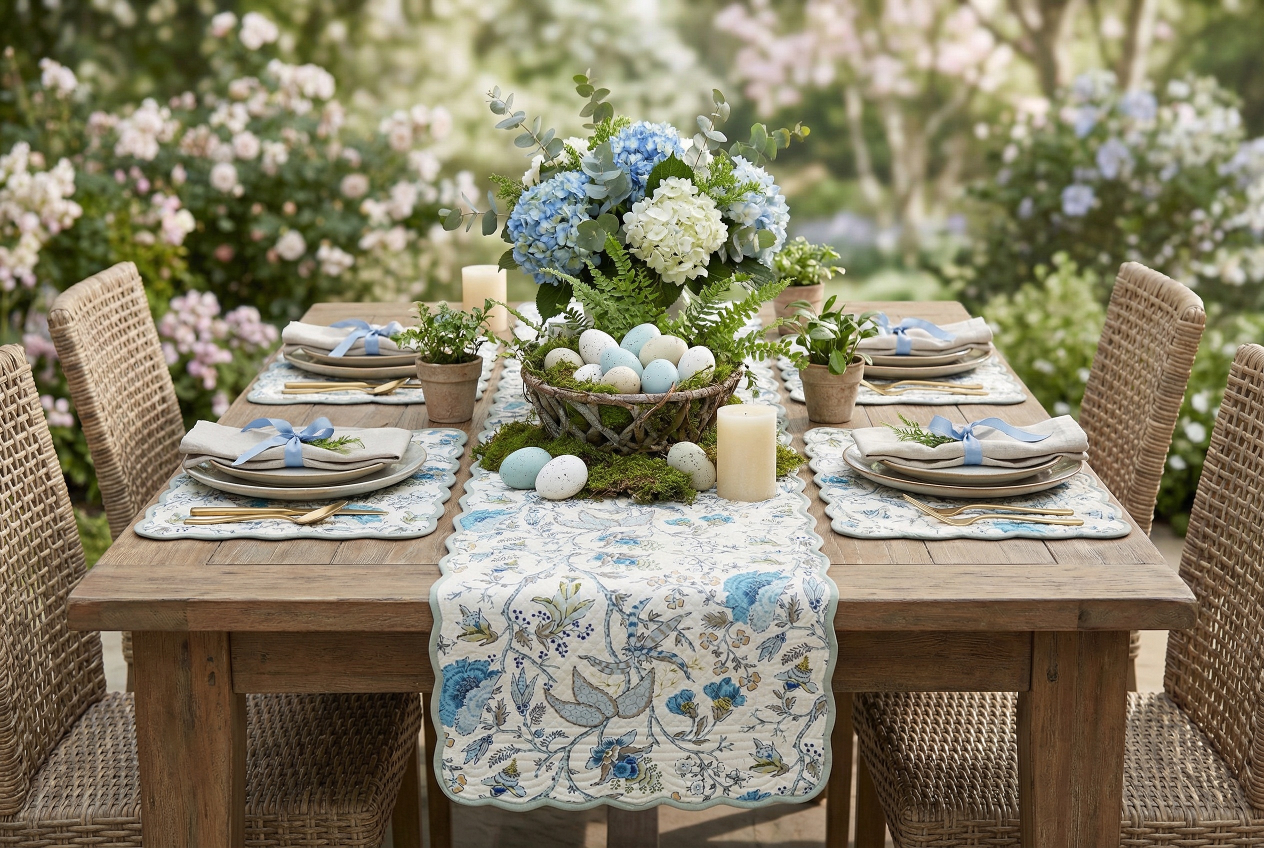 Elevate your dining experience with Bloom Collection’s Botanical Blues Runner, inspired by French toile and porcelain floral patterns. Each piece is meticulously handcrafted by skilled artisans using 100% premium cotton, ensuring both beauty and durability. This decorative cloth table runner offers a rich, quilted texture and timeless prints that add a touch of charm to any dining setup.