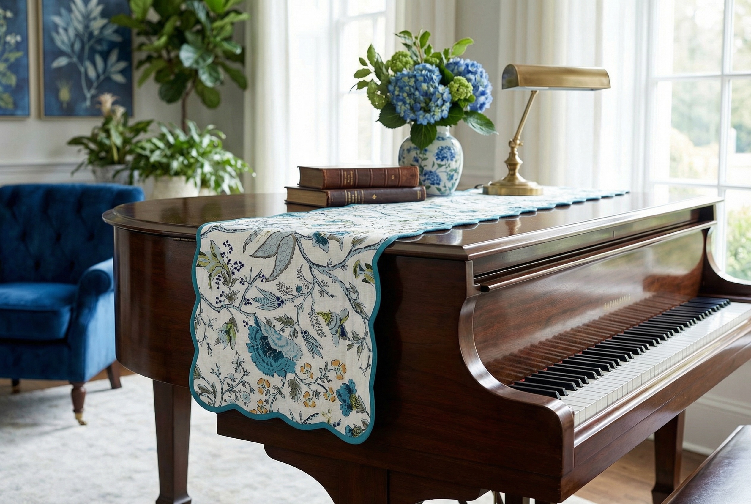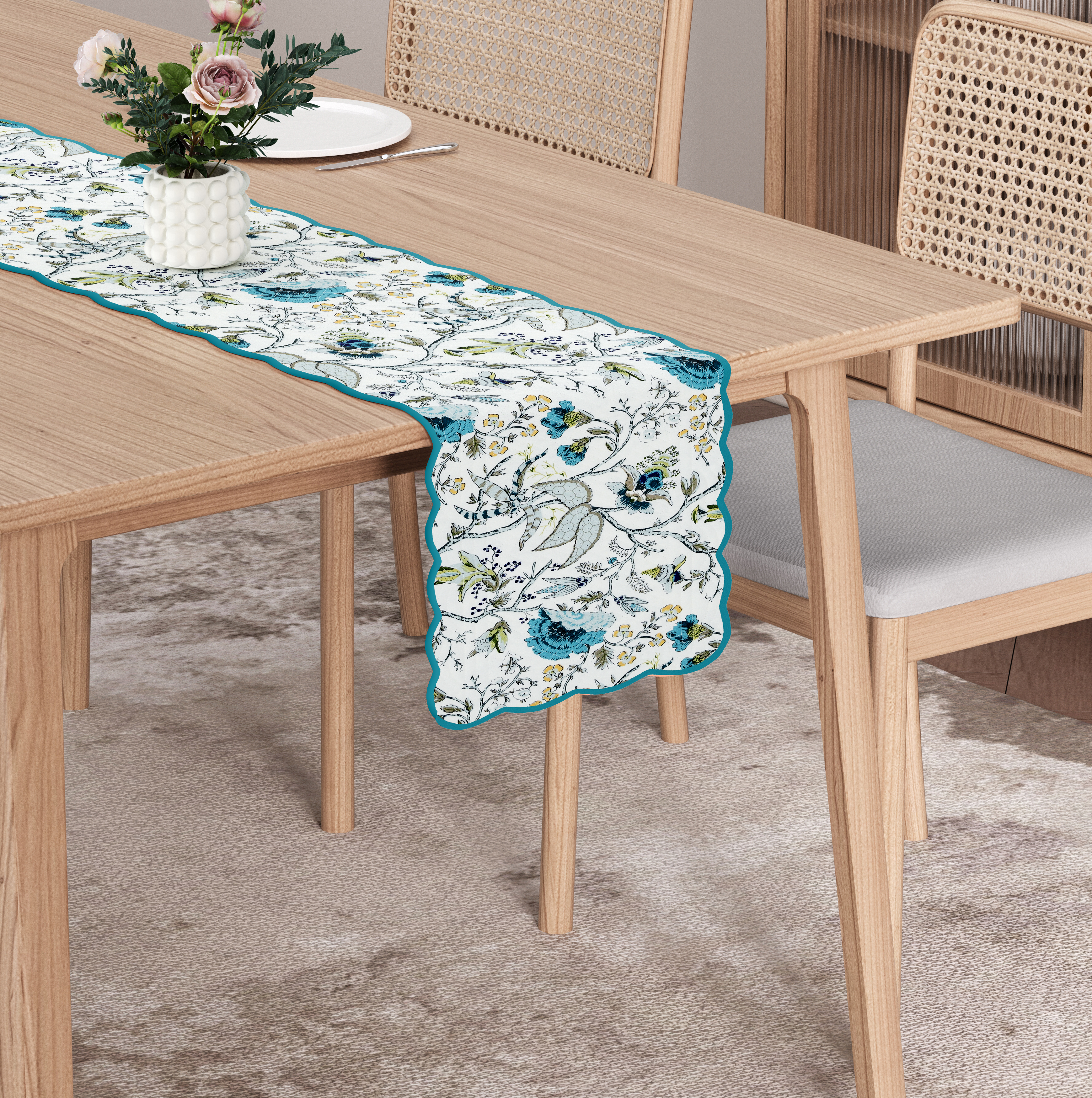 - Authentic Craftsmanship: Inspired by romantic French toile, vintage chinoiserie, and porcelain patterns, each Bloom Collection handcrafted runner features motifs such as paisley lilies, botanical roses, hydrangeas, leaves or birds, and is finished with a scalloped edge, showcasing timeless designs with contemporary elegance.