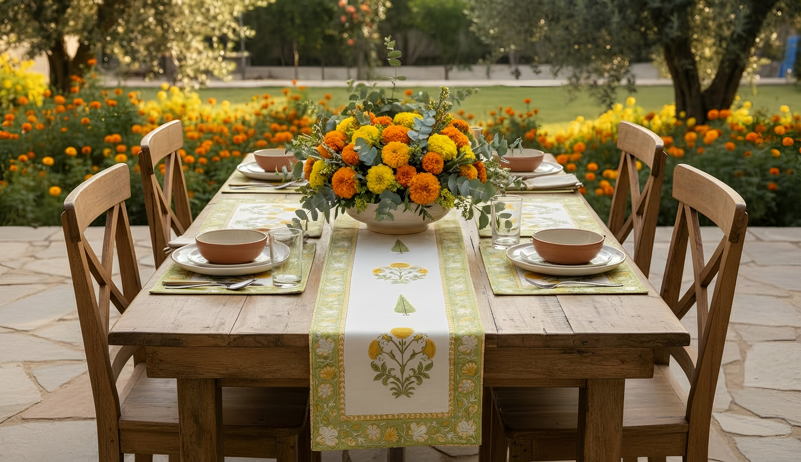 Bright, joyful marigold-inspired floral patterns bring a sunlit, festive feel to your table with this dining set. Soft cotton ensures a beautiful drape and lasting comfort, while the coordinated set makes table styling effortless. Perfect for cheerful gatherings, seasonal celebrations, or adding a pop of warmth to everyday meals. Each piece is made using traditional hand block printing, where artisans carve the design into wooden blocks and press them one motif at a time – creating a rich, textured design that brings warmth and artistry to your dining table.