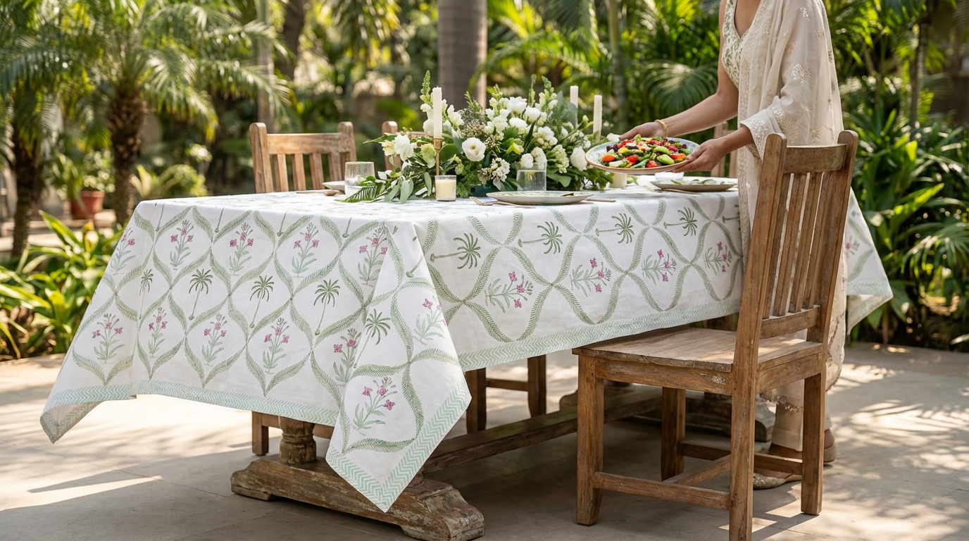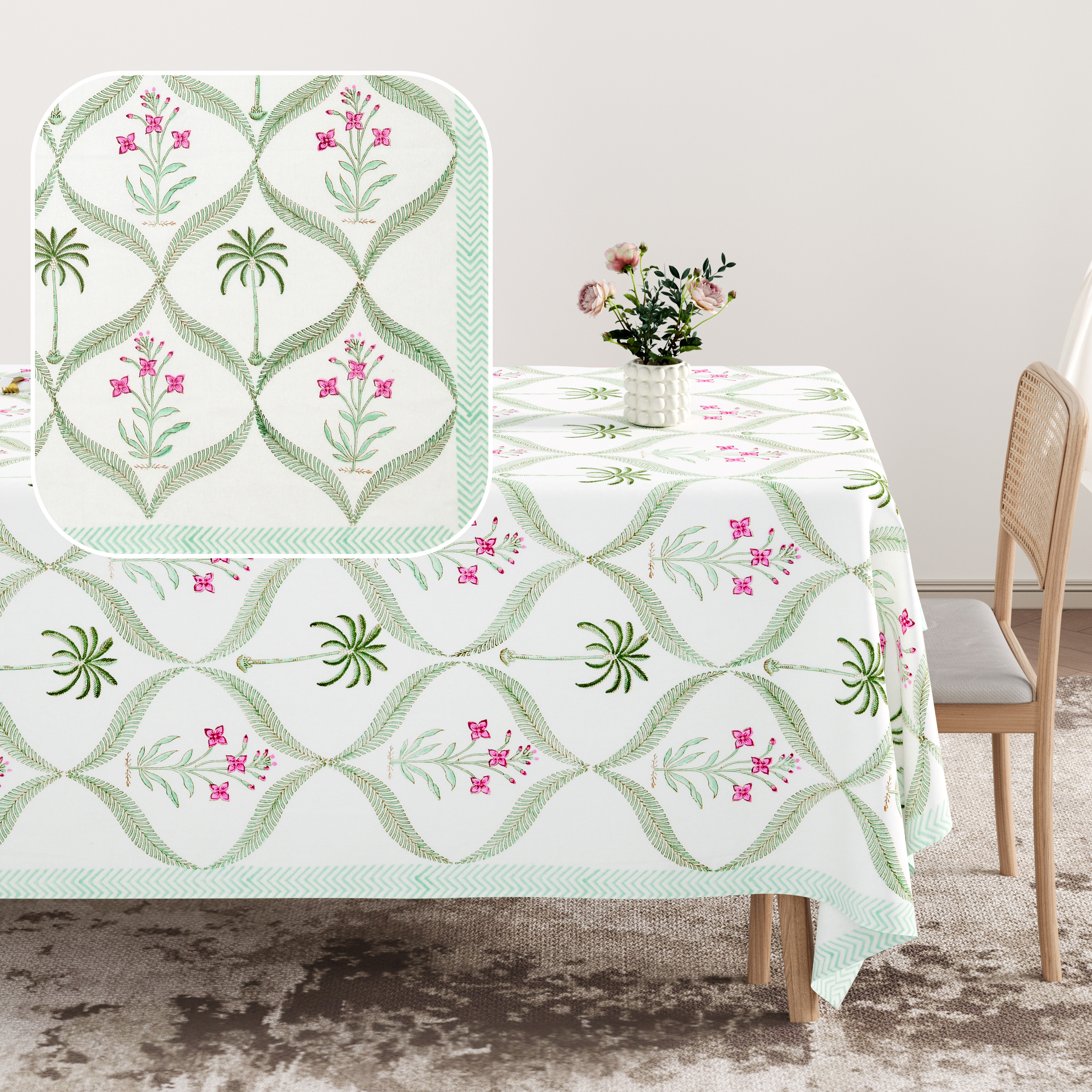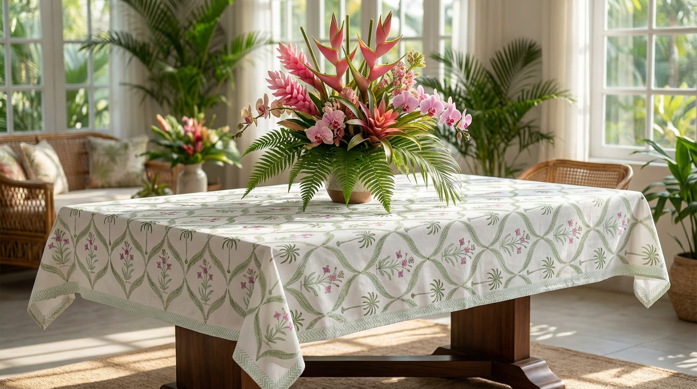 Fresh florals and soft pastels come together in Spring Petal Palm, a joyful botanical design that brightens everyday meals and elevates gatherings. Botanical and deeply grounding, the Spring Petal Palm tablecloth brings the feeling of a blooming garden right to your dining table. Set in soothing green tones accented with delicate floral and palm details, this design blends nature-inspired beauty with artisan authenticity. Perfect for homes that love earthy minimalism, botanical interiors, and cheerful fresh color palettes, Spring Petal Palm instantly brightens any dining environment.