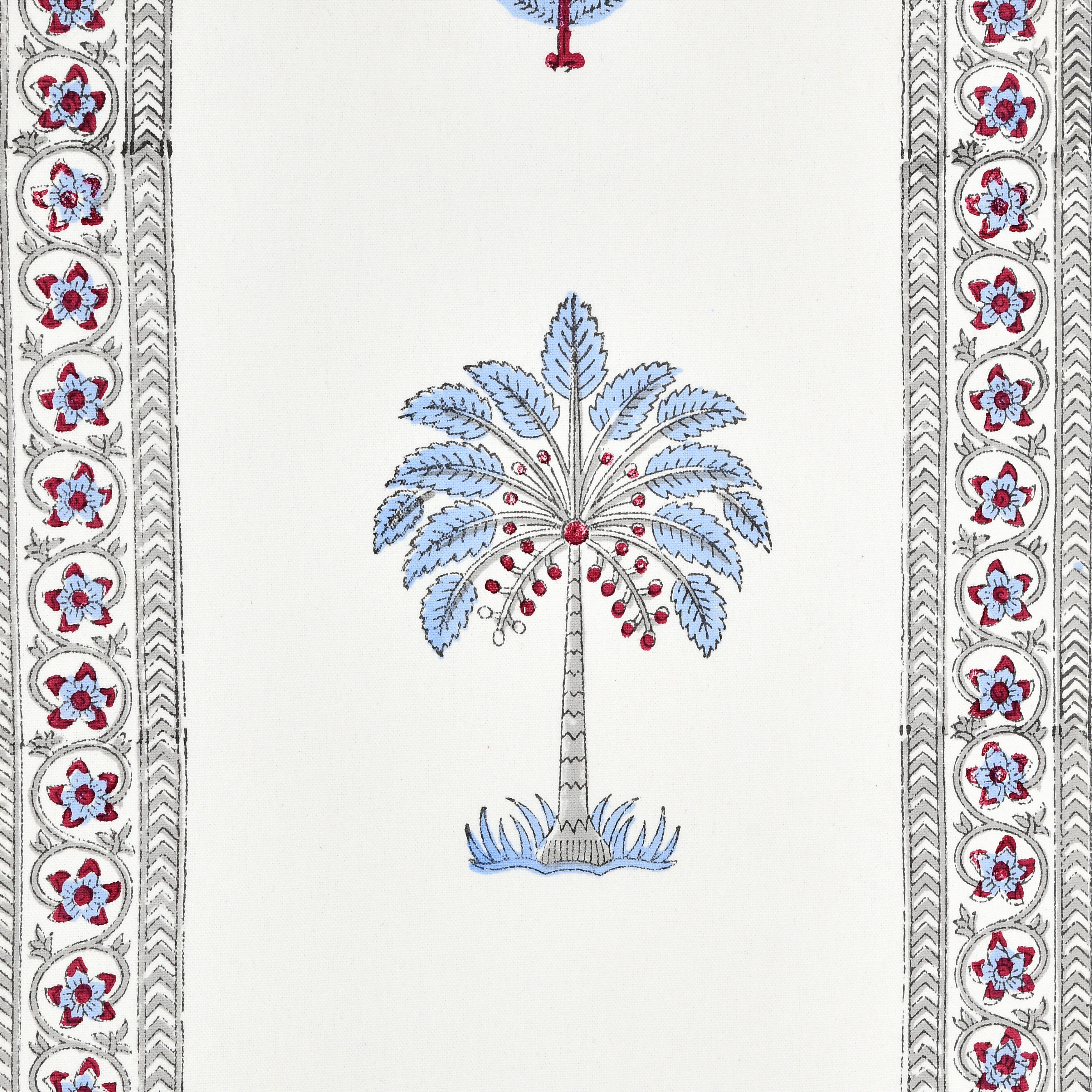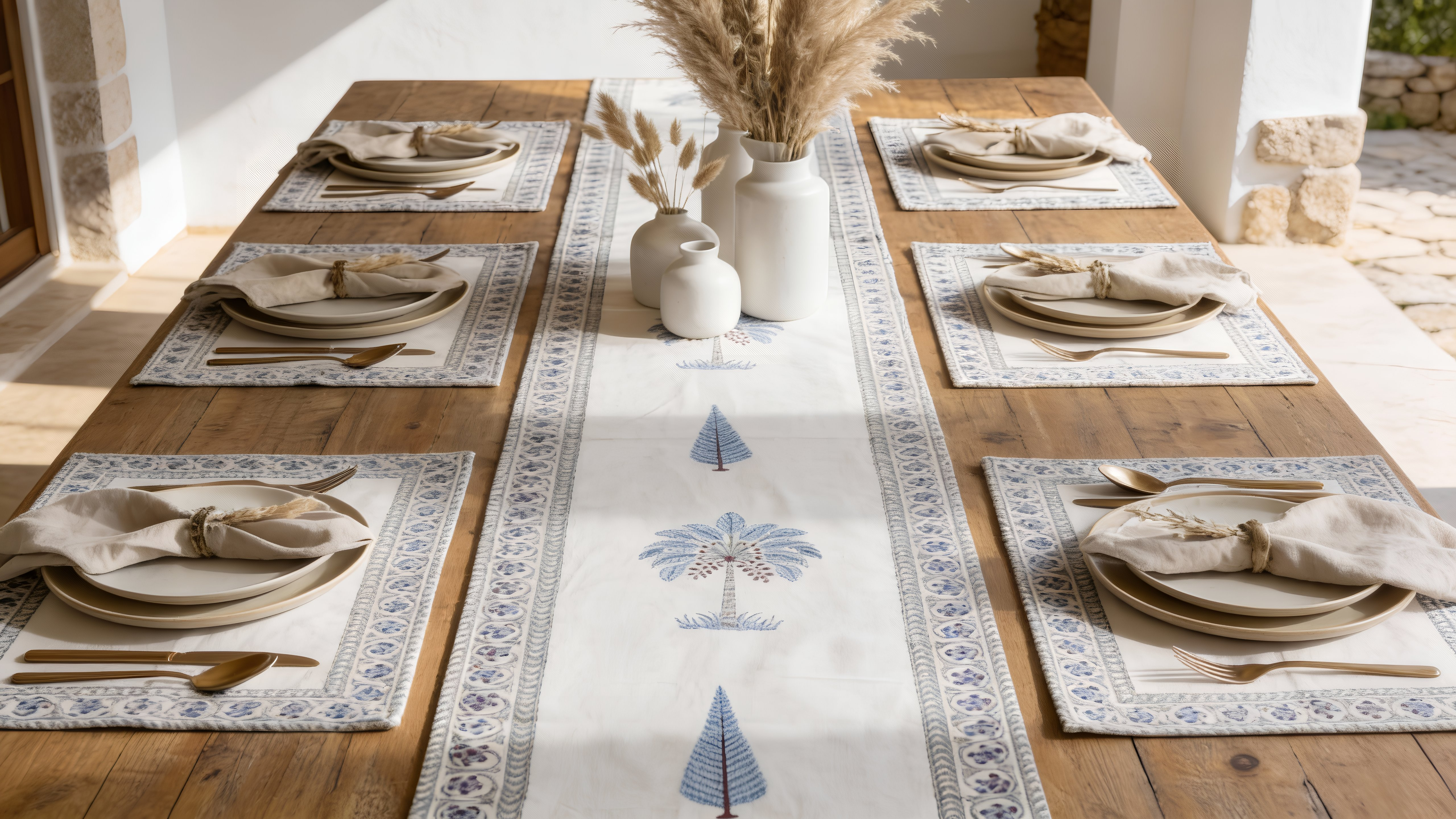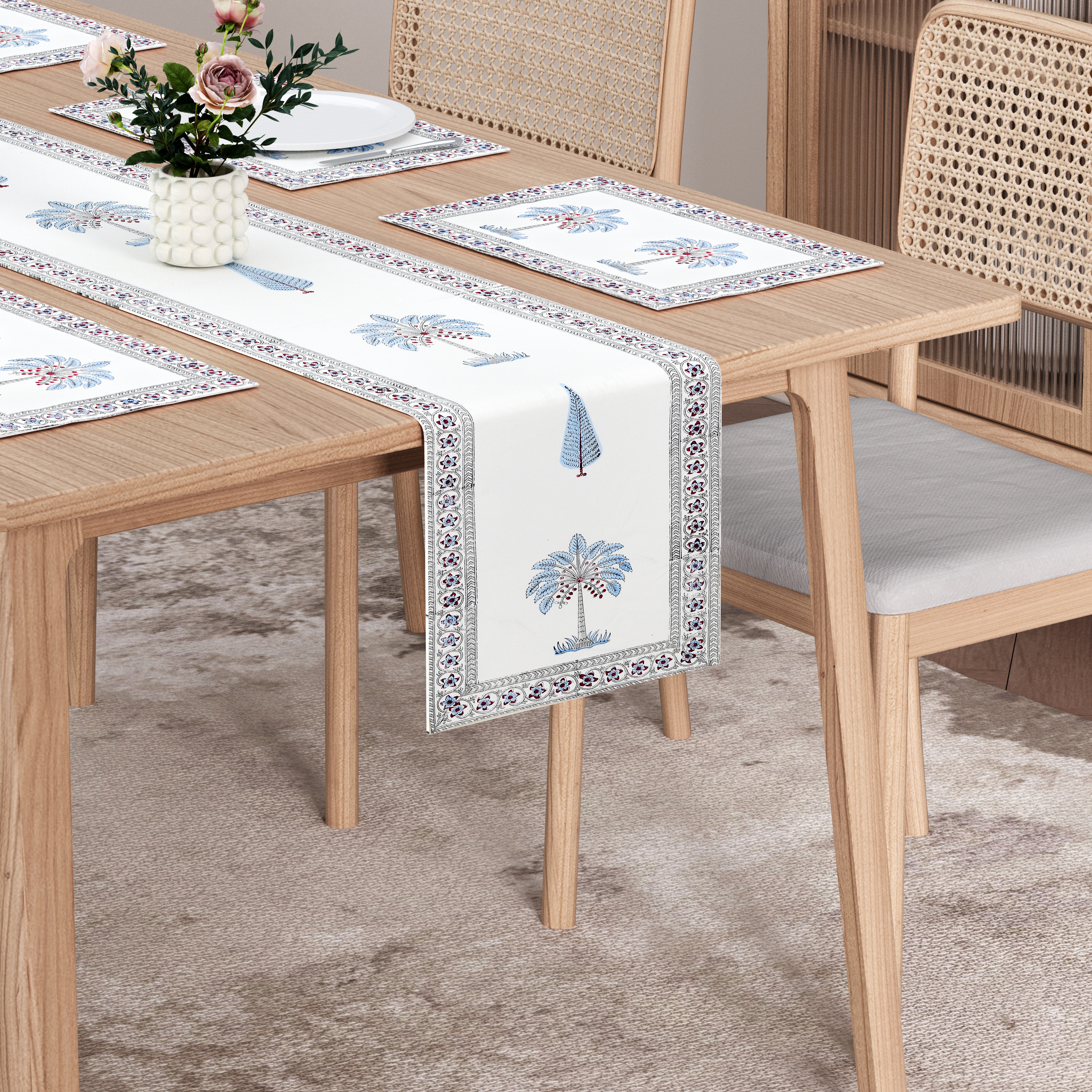 - Summer-Ready Santorini Palms Design: Breezy palm motifs in soft summer tones are hand block printed for a fresh, airy table décor.