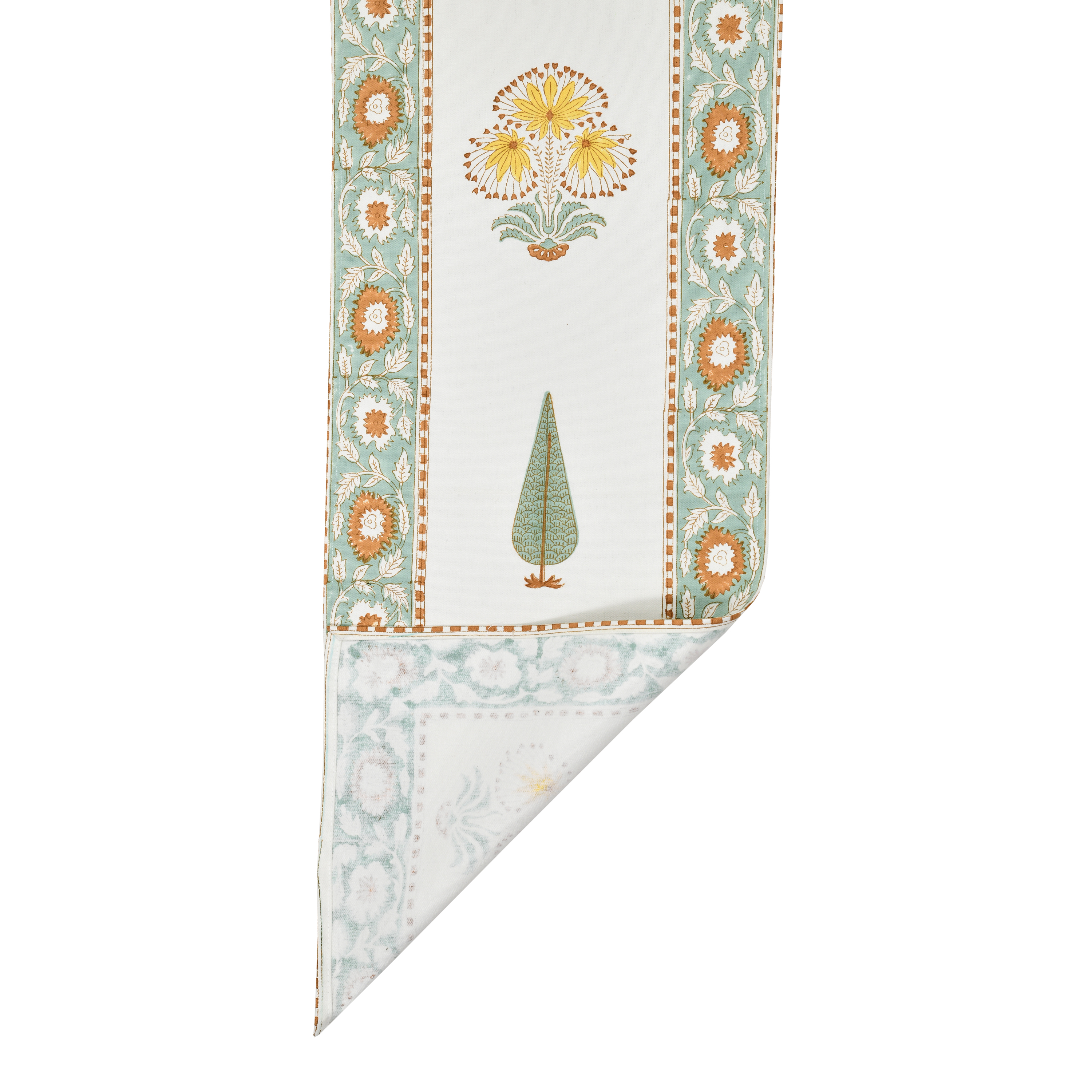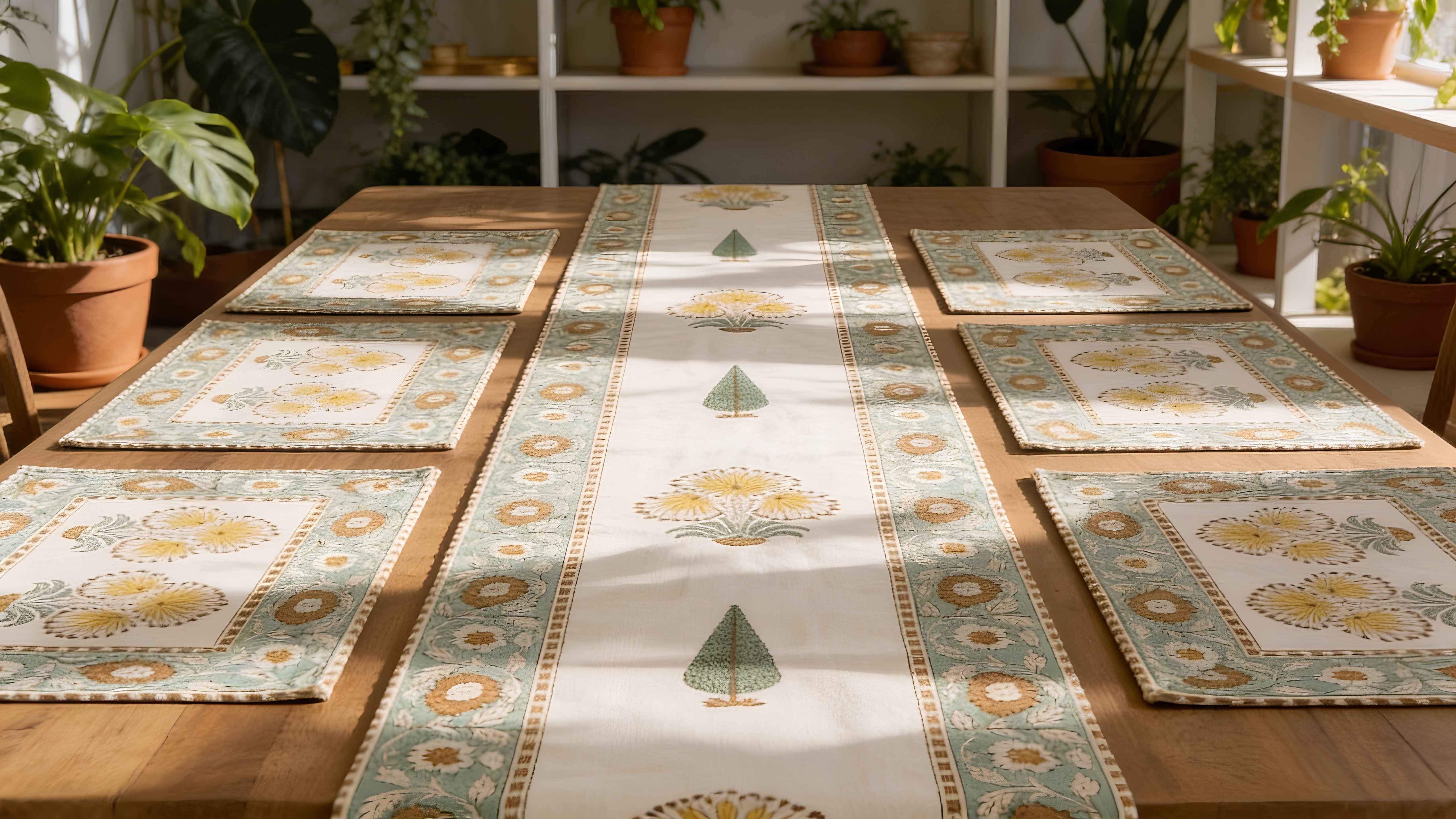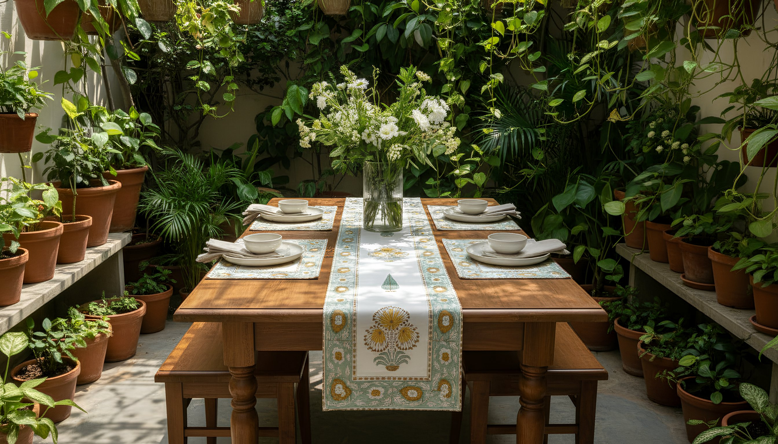 - Lush Verdant Courtyard Design: Deep green courtyard and rich foliage motifs are hand block printed, creating a rich, nature-inspired pattern that adds texture and visual depth to your dining table.